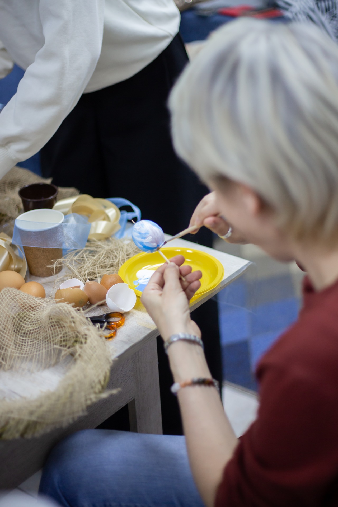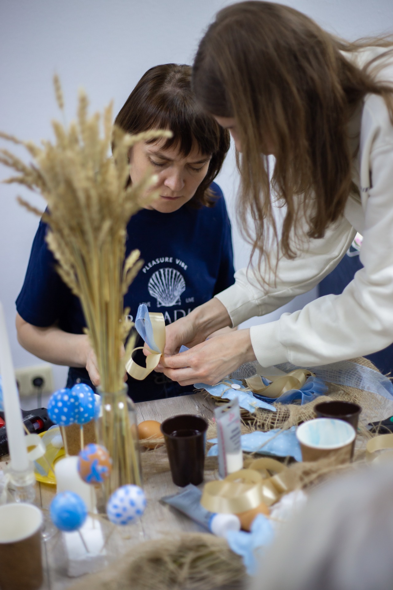 Под звуки весенней природы мы раскрашивали яйца, собирали их в общую, гармоничную композицию. Я поделилась с участниками основными принципами построения композиции, чтобы каждый венок получился уникальным и радующим глаз.